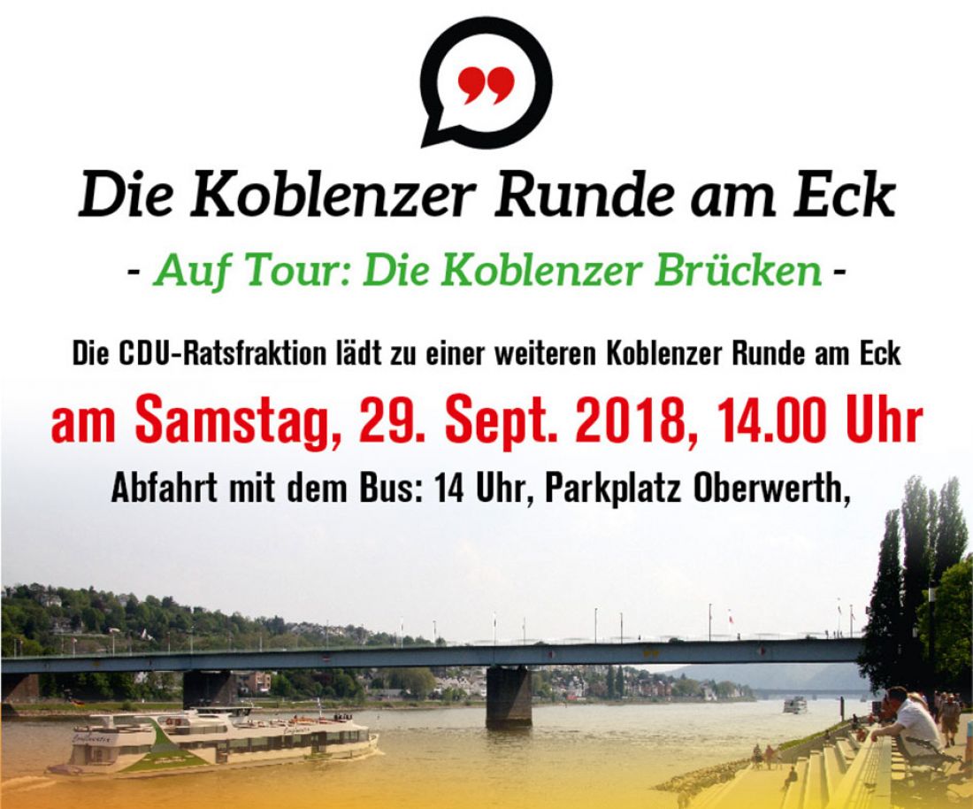 Die CDU-Ratsfraktion möchte im Rahmen ihrer Veranstaltungsreihe „Koblenzer Runde am Eck“ die Koblenzer Bürgerinnen und Bürger zu einer Informationsfahrt mit dem Bus zu einigen fertig gestellten oder in Planung befindlichen Brücken einladen.